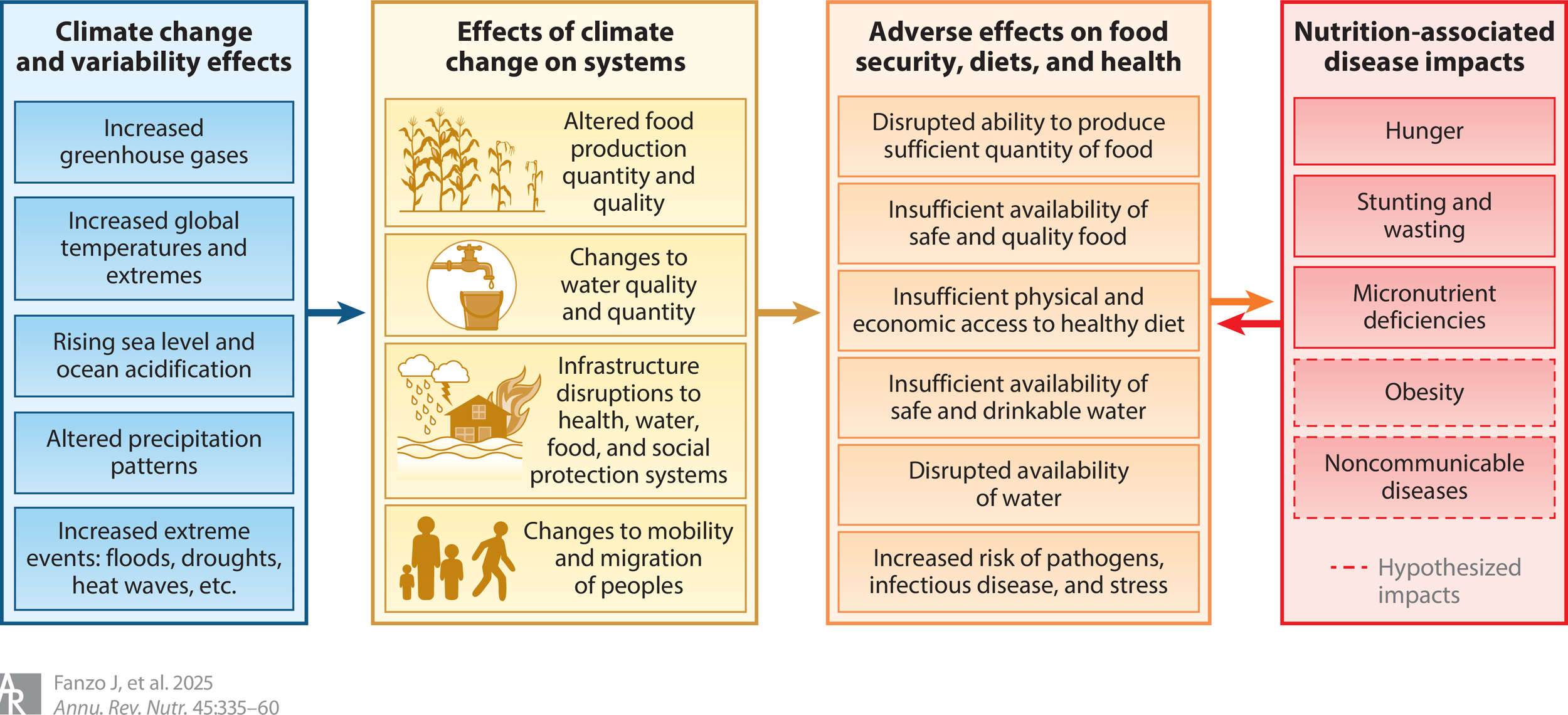 In the ongoing discourse surrounding climate change, the world needs a deeper examination of the multifaceted effects climate change and extreme weather events exert on global nutrition and food security. Climate change will likely intensify food insecurity, malnutrition, and the prevalence of noncommunicable diseases worldwide, as shifting climatic conditions disrupt agricultural production and water availability. It is also recognized that enduring effects can be expected as warming converges multiple climate stressors, thereby aggravating pre-existing vulnerabilities in food systems, particularly in low-income and resource-challenged regions.